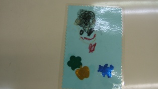 母の日。お母さんの似顔絵とかわいい形のホイル折り紙をラミネートします。